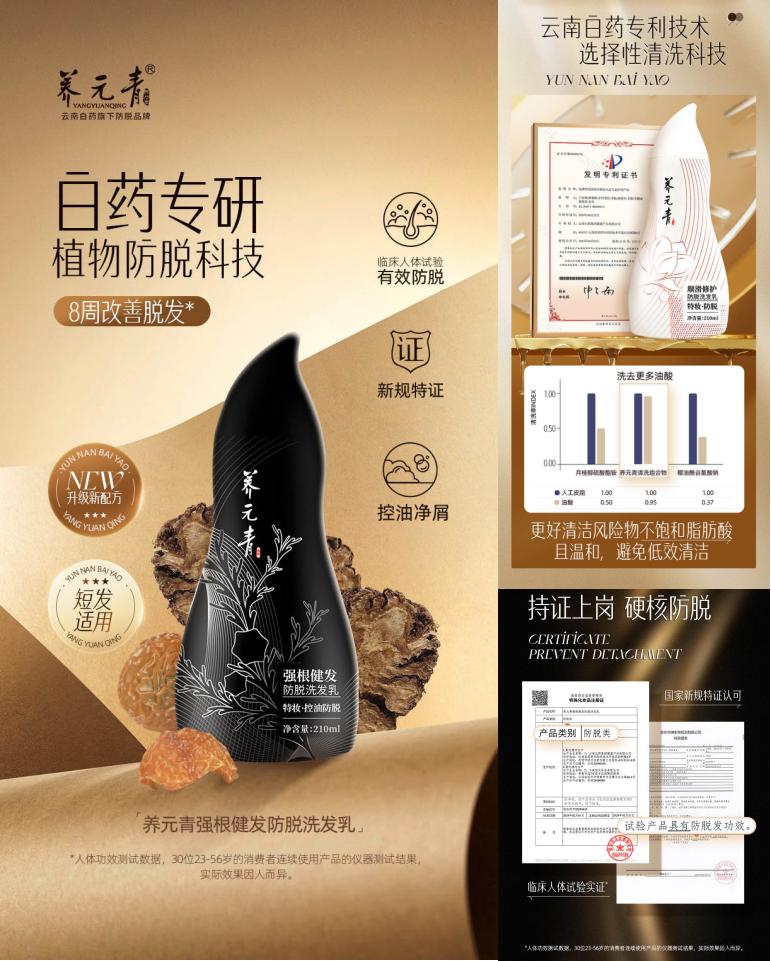 以动态短视频或直播的形式展示商品的高效率,加强“立见成效”的产品特性,建立消费者对高效产品的直观感知。以养元青为例,养元青为控油防脱而生。以医学技术为主题,以“植物防脱落”为理念,专注于防脱落细分赛道和大单品战略,在竞争激烈的防脱落市场脱颖而出,正在快速吸引需要防脱落的年轻消费者。该品牌还通过直播间将云南白药博物馆和植物产地转移到客户的视线中,直观地向消费者展示植物成分和R&D灵感来源,深入挖掘客户的需求点。借助主播的现场演示和短视频的动态呈现,与用户有着深厚的联系,将品牌价值从故事渗透到实际体验的全环节,进一步加强消费者对产品的信任和依赖。