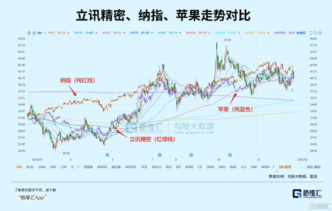 以立讯精密为例。如果去掉一些a股的特殊情况,比如24年2月各种仓位和平仓导致的下跌,24年9月24日后的暴涨,趋势与纳斯达克和苹果的相关性还是相当高的。