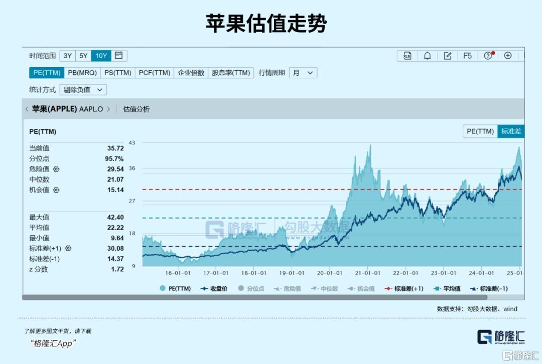 苹果动态PE估值方面 在过去的10年里,36倍的历史分位点是95.7%,所以一些投资者担心估值过高。