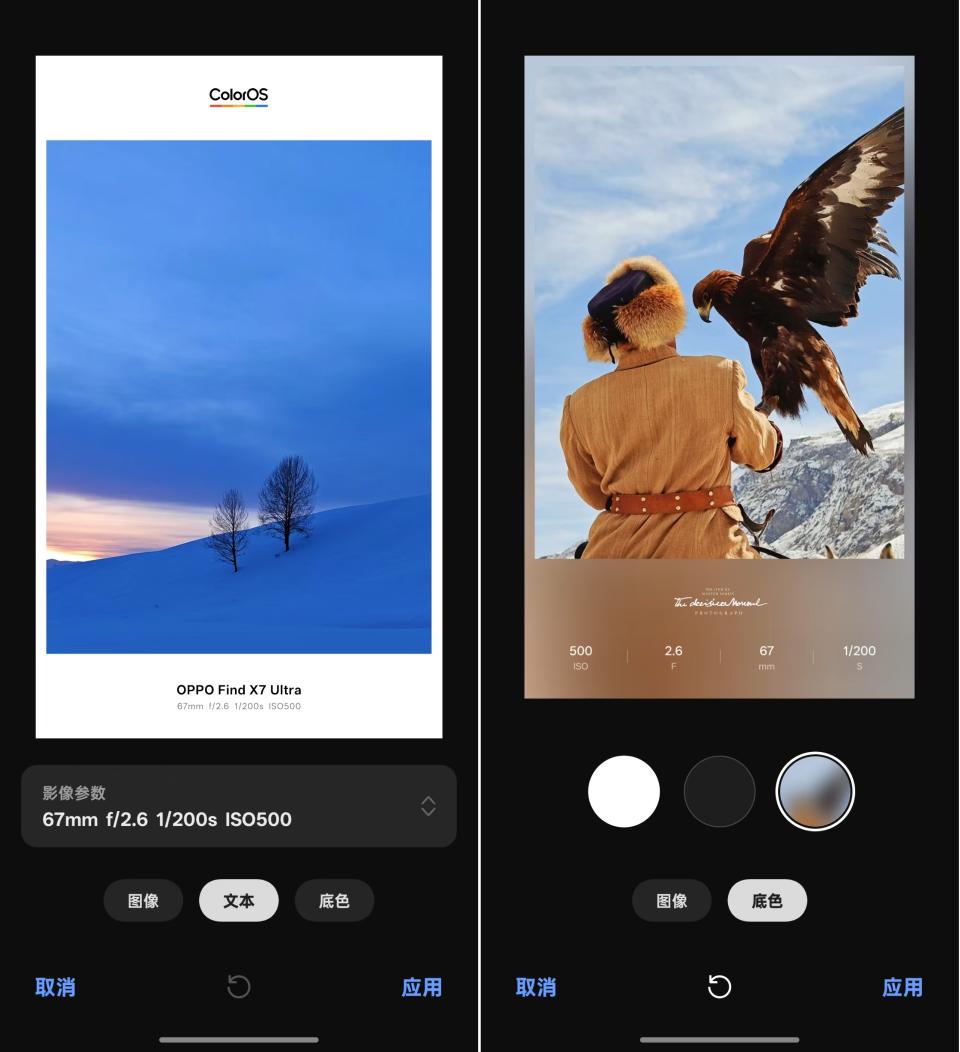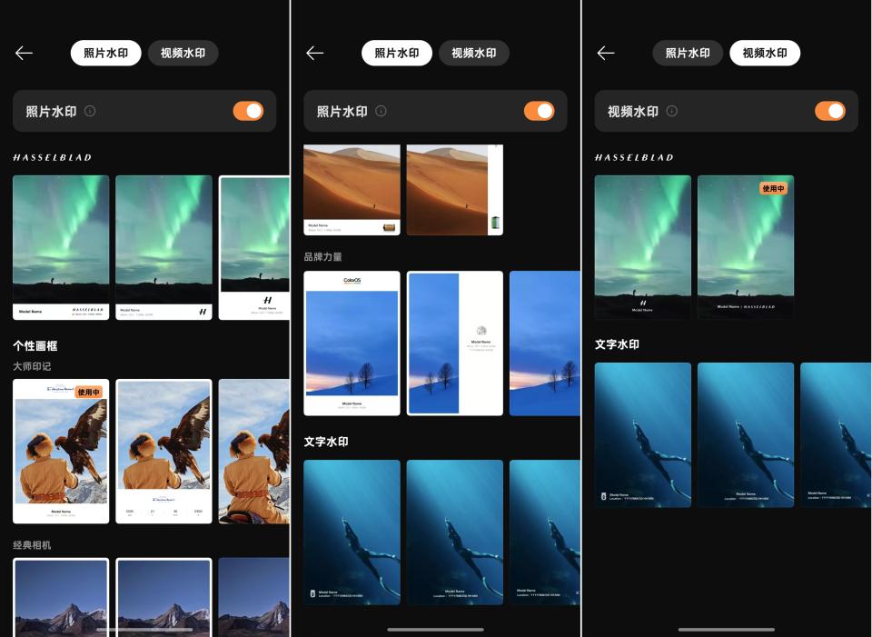 例如,OPPO不仅提供最简单的文字水印,而且在哈苏相机上也有类似的相框水印,将手机型号、哈苏官方LOGO和各种相机参数均匀地排列在相框上,给人一种专业严肃的感觉。
