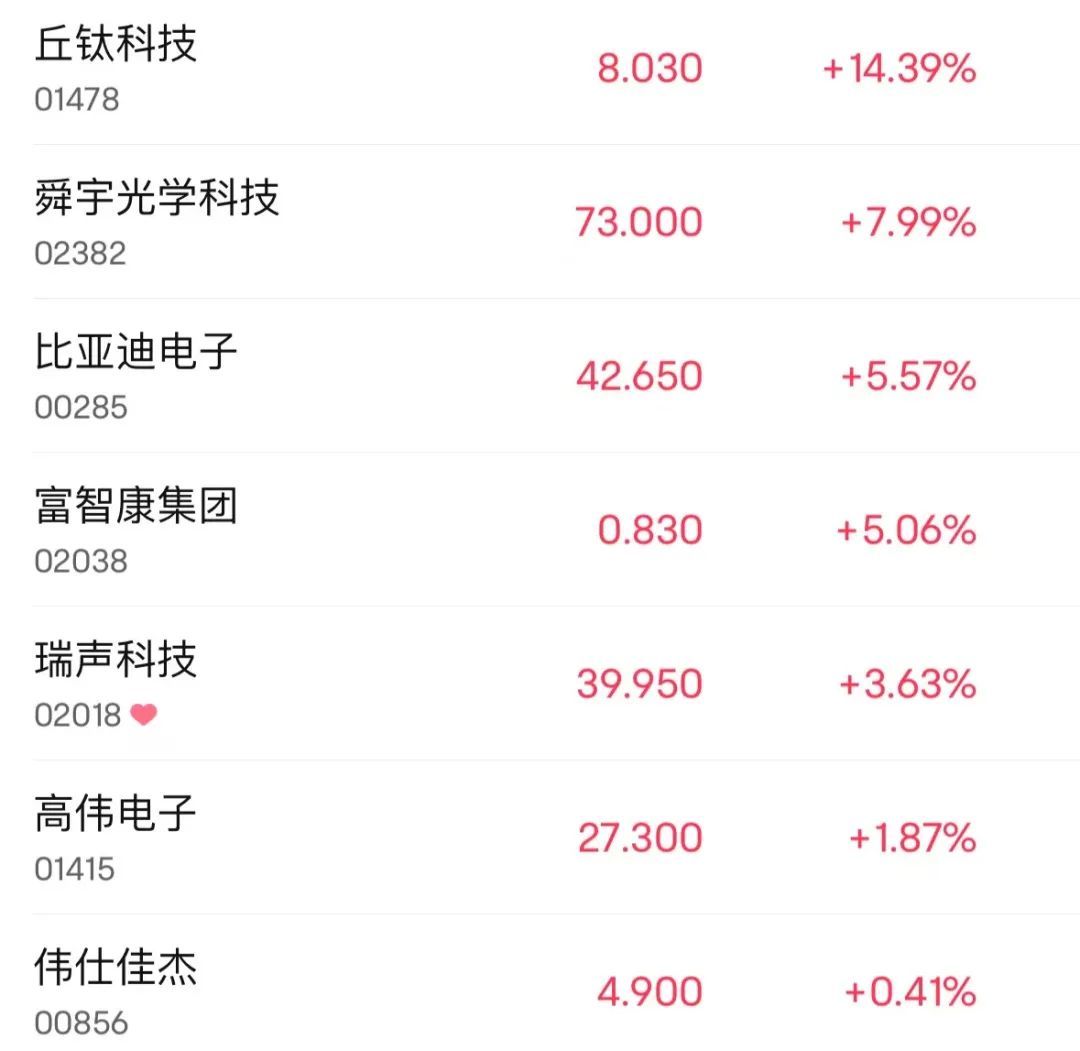超过14%的丘钛科技领先。