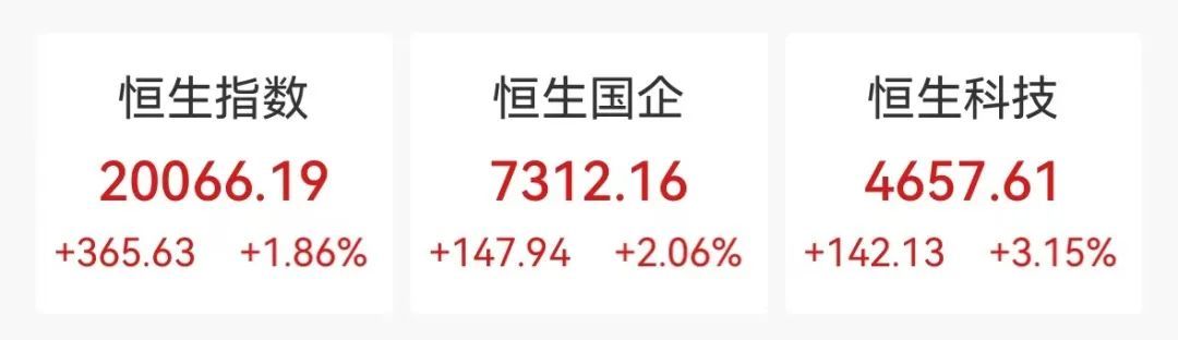 一月二十四日,港股三大指数集体上涨,盘中暴涨,恒生科技指数一度暴涨3.6%。截至收盘,恒生指数收涨1.86%,报20066.19点,本周累计上涨2.46%。;本周,恒生科技指数上涨3.15%,报4657.61点,累计上涨3.98%。;本周,恒生国有企业指数上涨2.06%,报7312.16点,累计上涨2.86%。