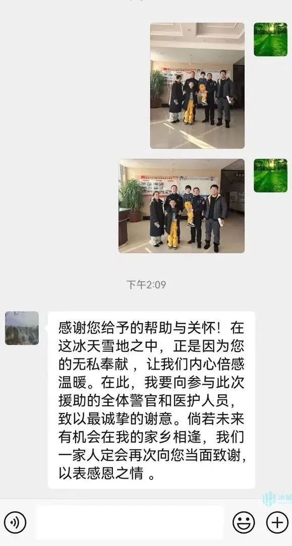 在回来的路上,警察收到了孩子父母的消息:“谢谢你的帮助和关心!在这个寒冷的日子里,正是因为你的无私奉献,我们的心才感到温暖。在这里,我想向所有参加这次援助的警察和医护人员表示衷心的感谢。如果以后有机会在家乡见面,我们一家人会再次当面感谢大家,表达我们的感激之情。”