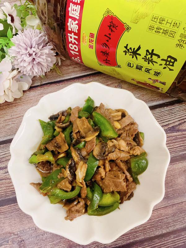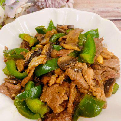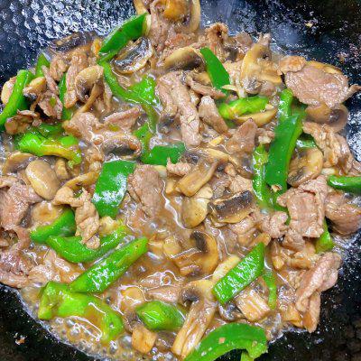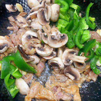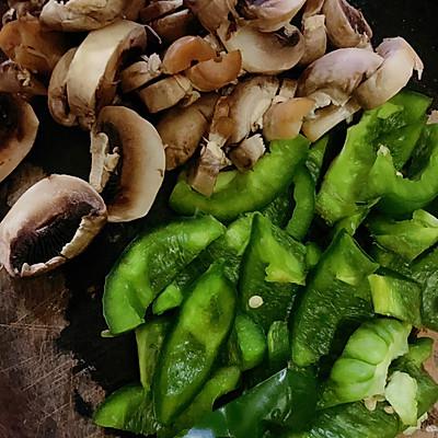 7、大火翻炒至变色,放入进口蘑菇和青椒