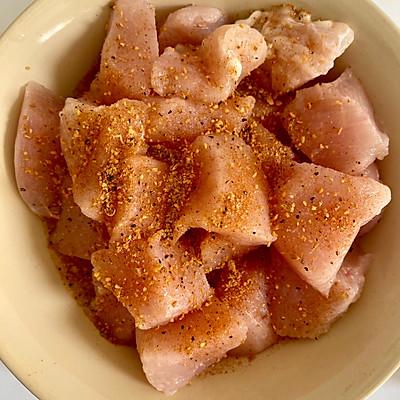 2、鸡胸肉加入适量的鸡肉专用调料,适当的米酒腌制去腥