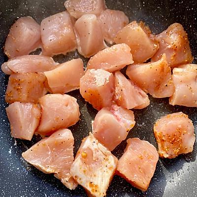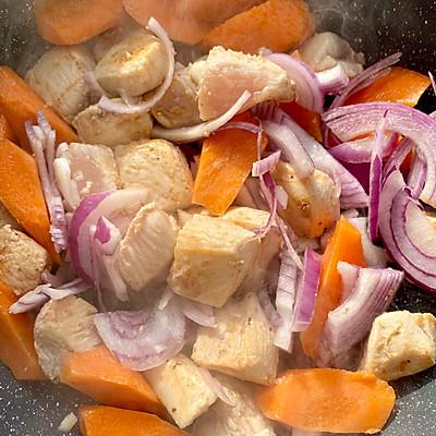 1、准备食材如图,鸡胸肉切块备用,胡萝卜洋葱切好备用。