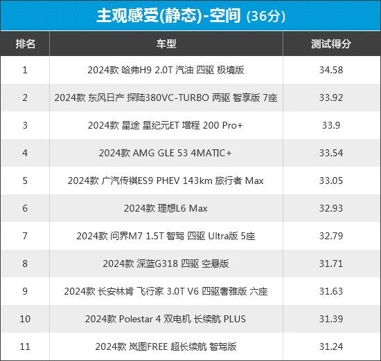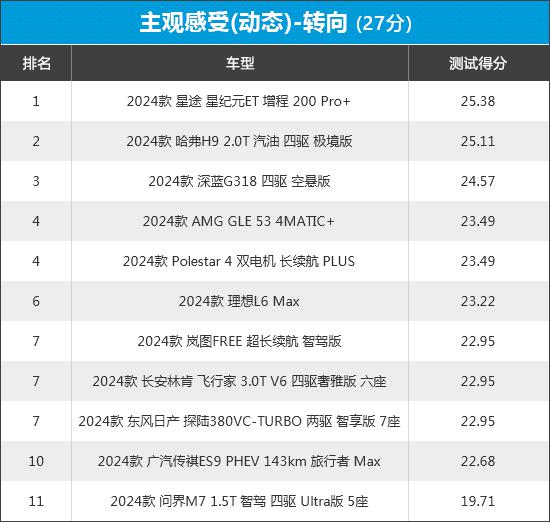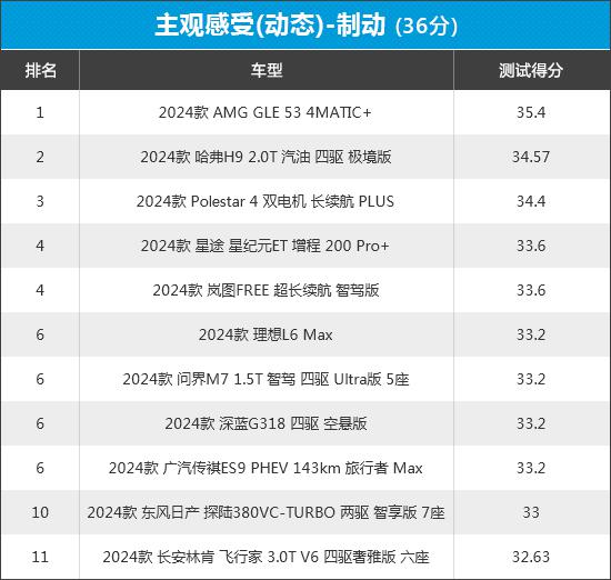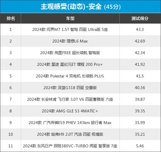 从以上每个评价维度的排名中可以发现,11 汽车的商品性能是相互胜负的。在这些人中,综合表现最为突出。 AMG GLE 53,在多个测试中都保持着较高的水平。但是在客观数据方面,除了 AMG GLE 53,Polestar 4 表现也很出色,在多次测试中取得了不错的成绩。就主观感受而言,具有自主高端定位的问界。 M7 和星途星时代 ET 各在 2 在项目测试中获得第一名,尤其是前者, AMG GLE 53 与此类进口性能车相比,动态 - 加快阶段以满分取胜,实在不容易。相比之下,东风日产探陆和岚图 FREE 在客观数据和主观感受方面,整体表现不尽如人意。 21 在项目测试中,两者各有多个测试项目排名垫底,以及其它测试项目。 9 汽车在商品水平上存在一定差距。