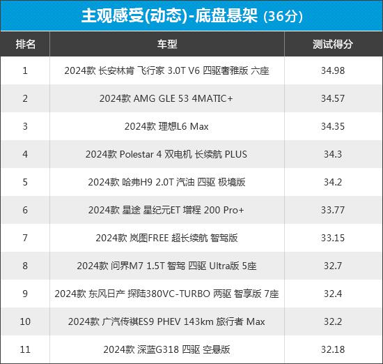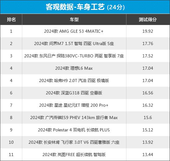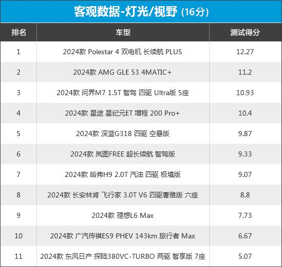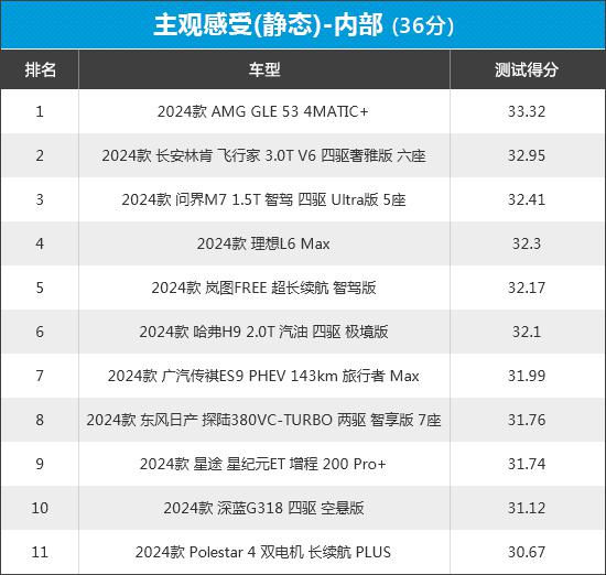 从列表中不难看出,AMG GLE 53 继续保持较高水平,现阶段表现突出,符合其豪华品牌车型定位,排名领先其他品牌。 10 汽车。相比之下,Polestar 4 这一阶段得分最低,这与其四个门顶都没有配置天花板拉手有关,造成丢分。