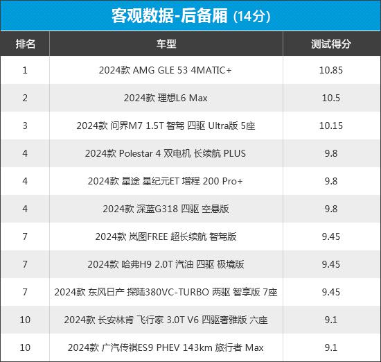 就榜单排名而言,AMG GLE 53 后备箱的各种测试数据表现出色,凭借实力再次获得榜首。相比之下,长安林肯飞行家和广汽传祺 ES9 双双垫底在本轮检测中,失分的主要原因是两人都提供了第三排座椅,造成后备箱深受影响。