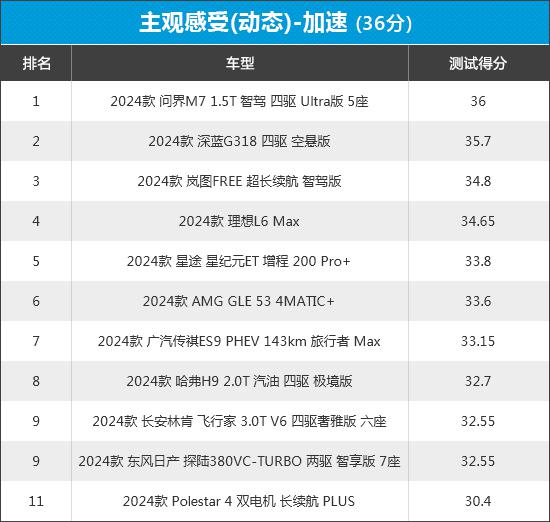 就列表排名而言,问界 M7 在加速踏板感觉、油耗、起步响应、性能和加速感觉方面,以满分获得第一名。相比之下,Polestar 4 得分和其他分数 10 车辆存在小差距,其在耗电方面丢分较多。