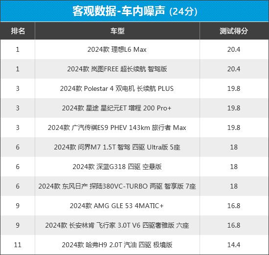 就榜单排名而言,理想 L6 和岚图 FREE 成绩相同,领先于其他成绩。 9 车内噪音和空调噪音的性能都值得肯定。哈弗 H9 车内噪声测试部分丢分较多,尤其是空调系统打开高档时测出的噪声值为 75.3dB,同级别车型明显高于测试过的车型,导致其排名垫底。