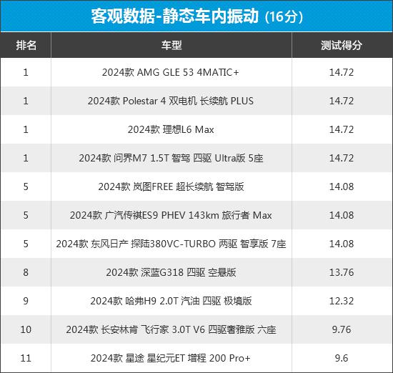 就榜单排名而言,AMG GLE 53、Polestar 4、理想 L6 和问界 M7 并列第一,可以看出这个 4 这款车能为驾驶员和乘客提供舒适的乘坐体验。值得注意的是,星途星纪元 ET 作为配备增程动力系统的车型,发动机在测试过程中没有参与工作,但每个测试位置的振动值明显较高,甚至高于配备纯燃油动力系统的长安林肯飞行家,导致其处于垫底位置,令人惊讶。