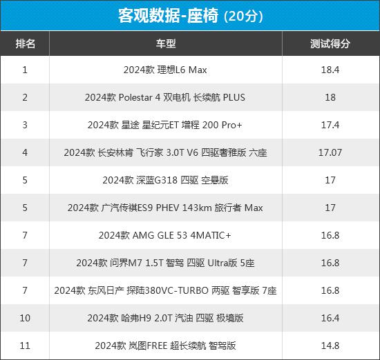就榜单排名而言,理想 L6 得益于较高的坐椅硬件水平, 11 在车型中脱颖而出。而且得分最低的岚图 FREE 丢分主要在于前面 / 后排座椅的座垫长度低于同级别车型测试过的平均水平。