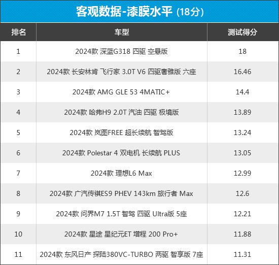 从列表中可以看出,深蓝色 G318 这个环节得了满分,整车漆膜厚度和喷漆均匀性都很好。此外,东风日产探陆排名垫底。虽然漆层的均匀性显著,但漆膜厚度的均匀性较低,影响了整体评分。