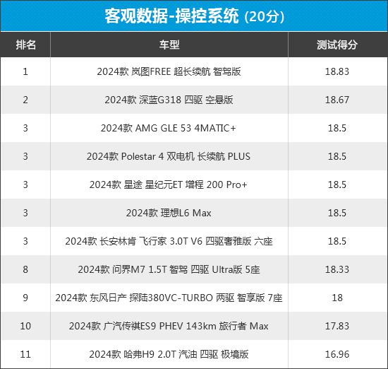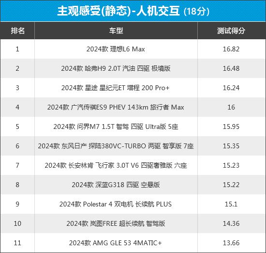 从 11 车子的分数可以看出,理想 L6、哈弗 H9、星途星纪元 ET 和广汽传祺 ES9 所有得分都超过或达到。 16 分。其中,理想 L6 在导航系统和语音交互方面发挥出色的技能压力。另一方面 AMG GLE 53 在人机交互方面,评分较低,主要丢分集中在语音智能交流和 HUD 在清晰度方面显示。