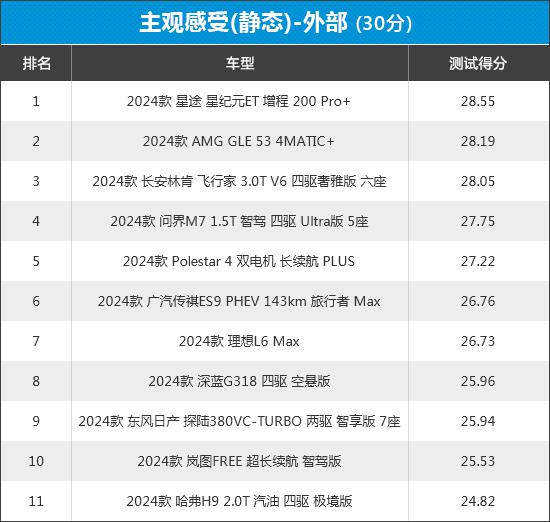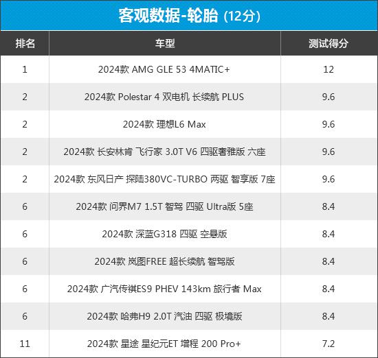 就榜单排名而言,AMG GLE 53 获得满分,主要是因为它的定位高性能。 SUV,对轮胎的规格和性能要求较高,自然价格也较高,超过了。 3000 人民币。反观星途星时代 ET,作为一款定位高端车型,轮胎是玛吉斯 VS5 SUV,单个轮胎价格不够 600 元素,丢分是不可避免的。