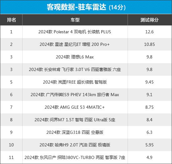 从排行榜的排名可以看出,Polestar 4 整体表现最好,排名第一。然而,东风日产探陆的分数与其他车型有很大不同。丢分的主要原因是后驻车雷达近期端检测距离与同级别车型平均检测距离略有差距。
