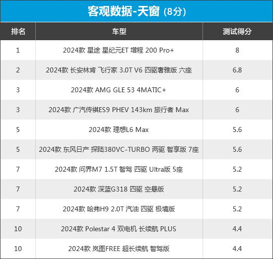 就榜单排名而言,星途星纪元 ET 以满分夺冠,整体表现明显优于其他。 10 款车。Polestar 4 和岚图 FREE 这一轮测试排名并排垫底,实际上两者的天窗面积占比都很好,但是不能打开导致分数下降。