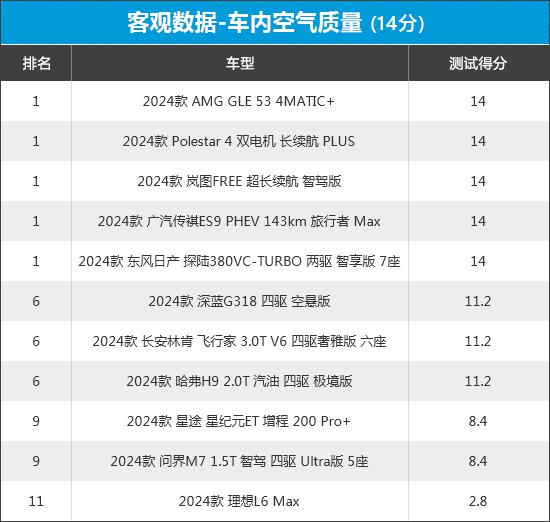 从排行榜上可以看出,11 款车仅理想 L6 车内检测到的甲醛浓度不符合评价标准,丢分严重,排名垫底。