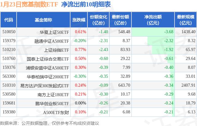 当天有 48 只宽基指数 ETF 资金净流出的基金,其中华夏上交所净流出排名第一。 50ETF(510050)减少了份额 1.4 一亿份,净流出额为 3.68 亿元。
