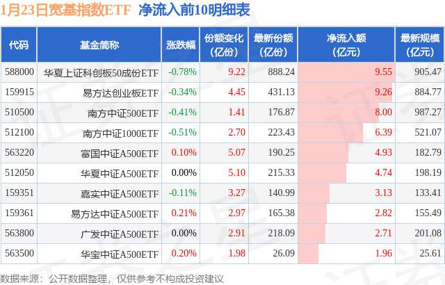 当天有 104 只宽基指数 ETF 资金净流入出现在基金中,其中华夏上证科技创新板排名第一。 50 成分 ETF(588000),份额增加 9.22 十亿份,净流入额为 9.55 亿元。