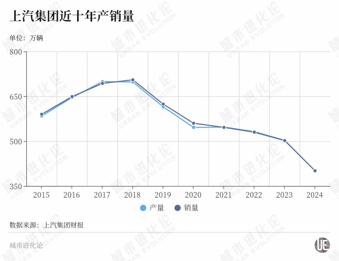 事实上,SAIC集团的整体销量下滑已经持续了很多年。2018年巅峰时期,其年销量超过700万台,之后逐渐减少到401万台。2024年是最大的一年。