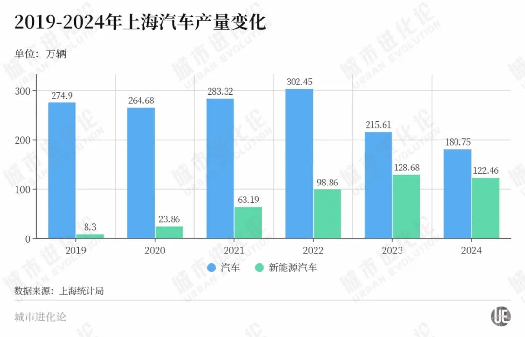 更加值得注意的是,即使只看新能源汽车,上海的产量也在下降。2024年,上海新能源汽车产量达到122.46万辆,同比下降4.8%。