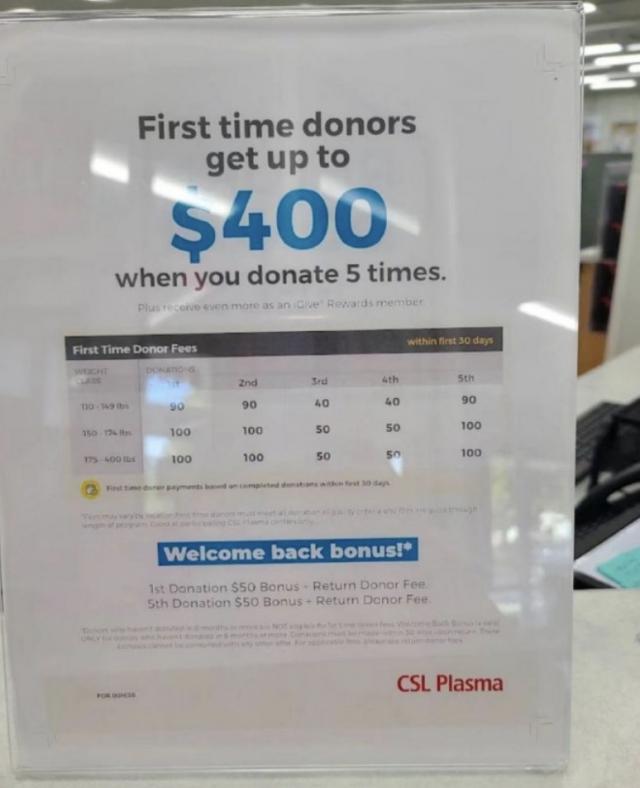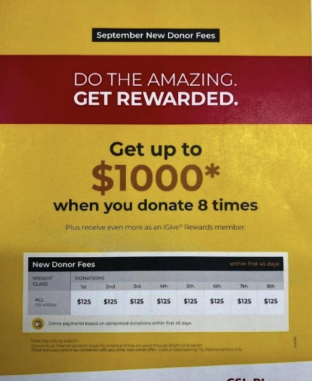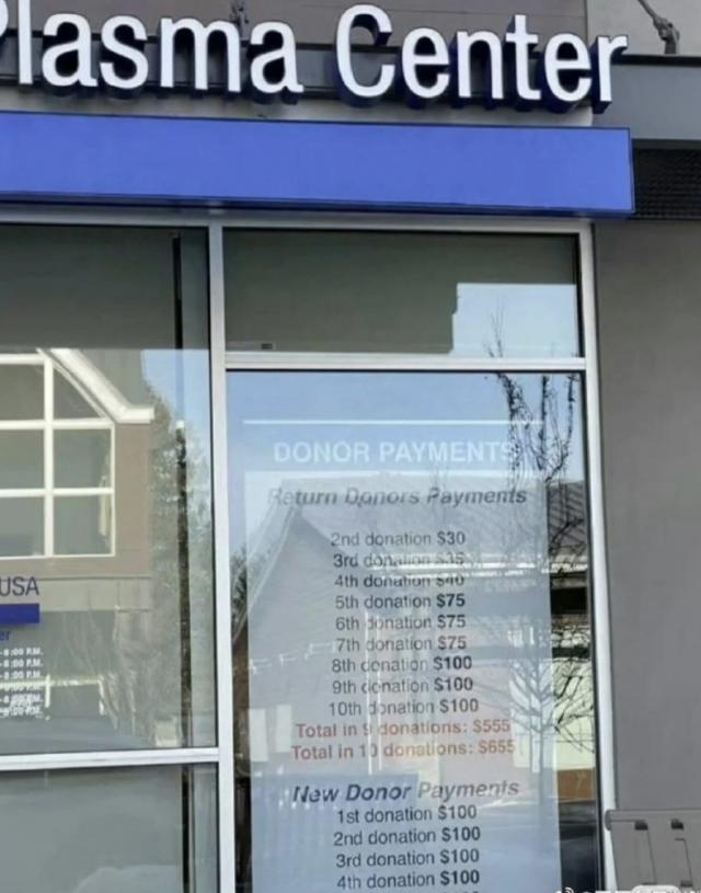 我不相信“十连抽礼包”。没想到美国真的有。其他人直接写在广告牌上,鼓励大家多抽,多抽。一个月每次卖血,都会比上次赚得多,第十次最多!45 每天抽八次,每次 200 从头开始,第八次就可以得到 1000 奖励美元!是的,这笔钱还要交“血税”。