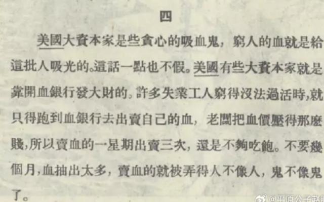 “美国失业工人太穷了,活不下去。他们去血银行卖血,甚至一周卖三次,勉强能养活自己。”现在美国更厉害了,不仅失业工人卖血,普通有工作的人也卖血,60。 老人和老太太必须卖血,一些中产阶级在被贷款迫害时必须卖血...有些妈妈用卖血的钱带孩子去动物园,有些学生用卖血的钱请同学喝咖啡。卖血的钱,还要交税,甚至还有“卖血最低十连抽”。
