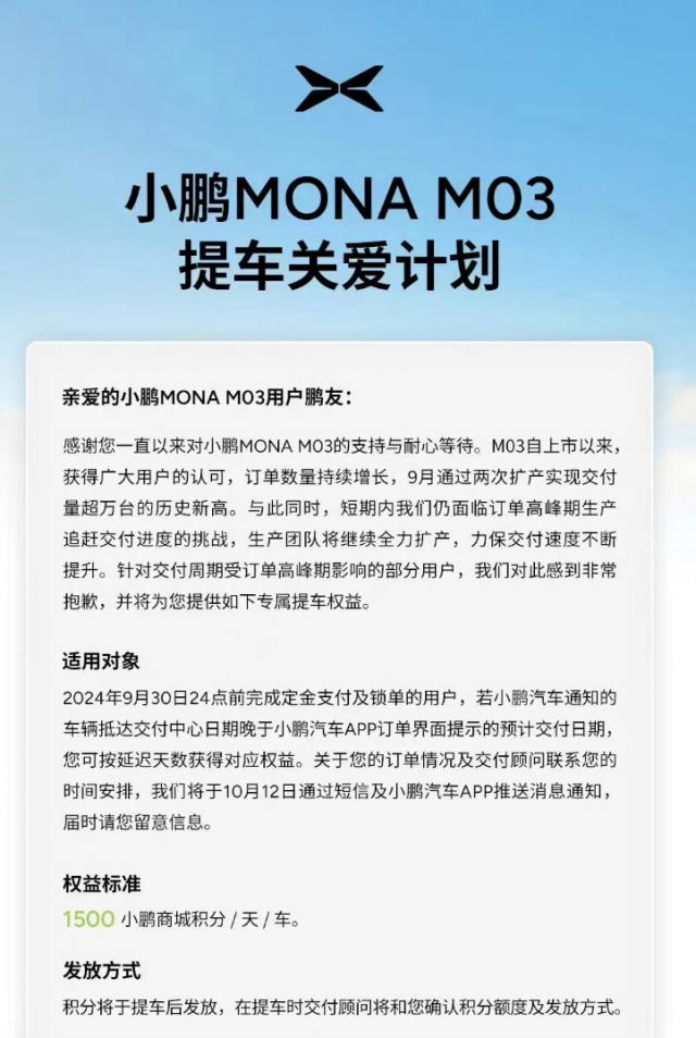 比如对于 MONA M03 订货,不再是 72 小时锁单,但延长至半年,可在半年内随时退订。 5 千元定价。另外,对于延期的车主,小鹏汽车也发布了一份“关怀计划”。9 月 30 日 24 点前完成定金支付和锁定订单的用户,如果小鹏汽车通知的车辆到达交付中心的日期晚于小鹏汽车 APP 订货界面提示的预估交货日期,可以根据延迟天数获得相应的权益,权益标准是 1500 小鹏商城积分 / 天 / 车。但是这样的权益显然不能跟随。 2 与万元真金白银相比,更不用说这种权益了。 9 月 30 日锁单用户。