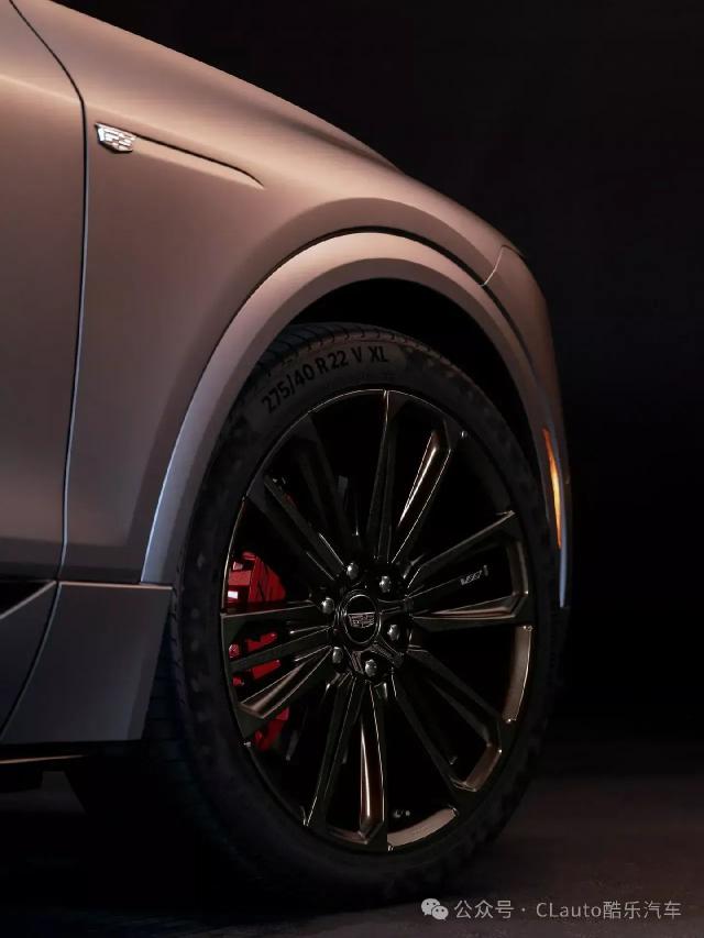 刹车部分,这辆车搭载 Brembo 刹车,前刹车盘的直径是 390 mm,与标准车型相比,刹车盘更大,更近 71 mm。除更强大的制动系统外,Lyriq-V 还提供带 V 红色制动卡钳系列标识。