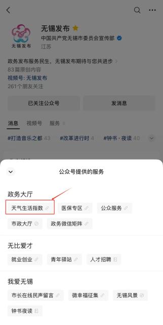 单击菜单栏中的“政务大厅”-“天气生活指数”,即可看到。