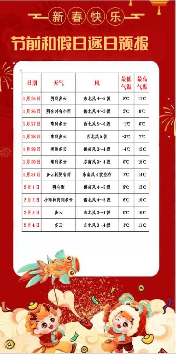 根据最新气象数据,今年春节期间天气变化很大。节前有一个弱寒潮天气过程,节中期有一个明显的降雨过程。期间没有下雪也没有结冰,整体影响不大。