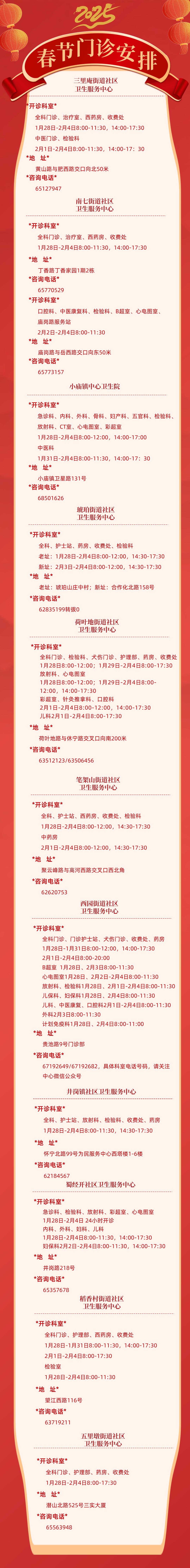 春节期间,蜀山区镇、街道、开发区基层医疗卫生服务中心具体开放时间、开放科、咨询电话等内容如下。如有需求,市民可合理安排时间就医。