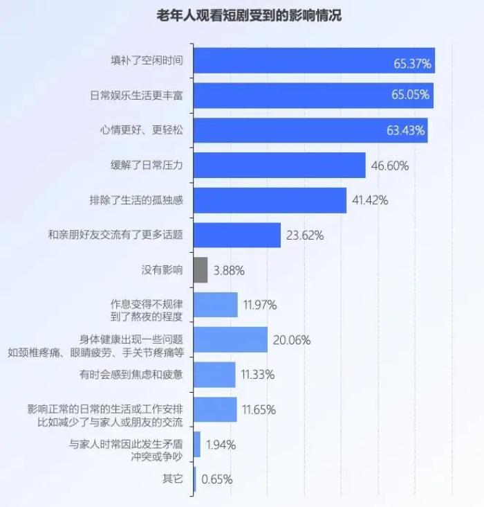 但是问卷调查的结果也显示,超过11.97%的老年人因观看短剧而变得不规律,甚至到了熬夜的程度。超过20%(20.06%)的老年人表示,看短剧会引起颈椎酸痛、眼睛疲劳、手关节疼痛等一些健康问题。超过10%的老年人(11.33%)表示,看短剧有时会让他们感到焦虑和疲惫,同时也有少数老年人(11.65%)感到影响他们的日常生活或工作安排。