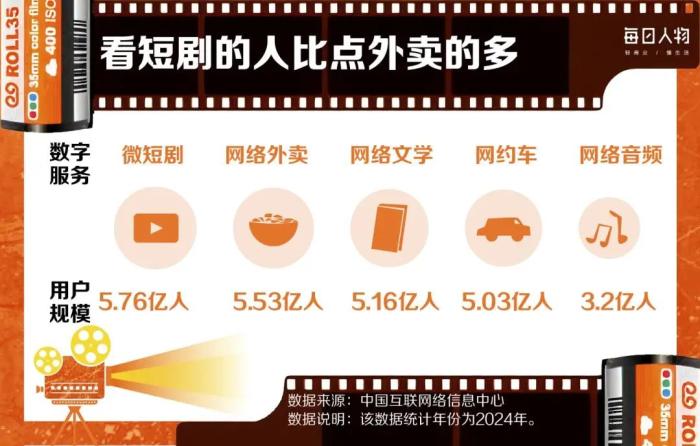 短剧的用户市场非常巨大。根据《中国微型短剧产业发展白皮书(2024)》,截至2024年6月,我国短剧用户数已达5.76亿,占整个网民的52.40%,已超过网上外卖、网络文学、网约车用户数。