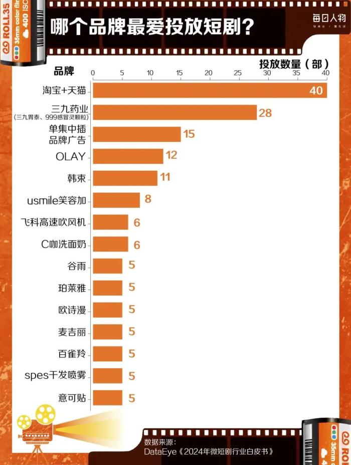 从品类上看,美妆个人护理品牌是最喜欢投资短剧的。韩束、彩棠、丸美、倩碧、珀莱雅等。经常出现在每部短剧的赞助名单上。此外,药品和生活品牌也在积极参与。去年,三九制药公司赞助了28部品牌短剧。