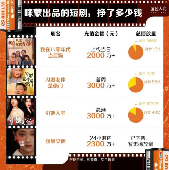 从微信官方账号的图片和文字到短剧视频,咪蒙将一个“爽”字贯彻到底——清醒大女主持人的设计,快节奏的冲突和翻转,再加上容易传播的金句台词,改变赛道的咪蒙依然依靠准确把握观众的情绪和人性,赚了不少钱。《我是上世纪80年代的后妈》上线当天充值金额超过2000万。相比之下,去年的口碑片《周处除三害》第一天票房就是1812万。但这笔钱,并非全部进入咪蒙的口袋。听花岛负责人曾经说过,《我是上世纪80年代的后妈》的最终净利润是200多万元,按照分成比例计算制作成本和团队奖金。