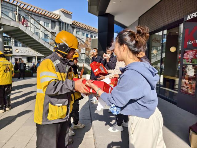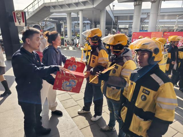 骑手兄弟和商家之间的双向友好互动温暖了整个街区。在这里,骑手们变成了“祝福特使”,为大大小小的商家送去了精心准备的“财富桶”,祝愿商家在新的一年里有很多财富。