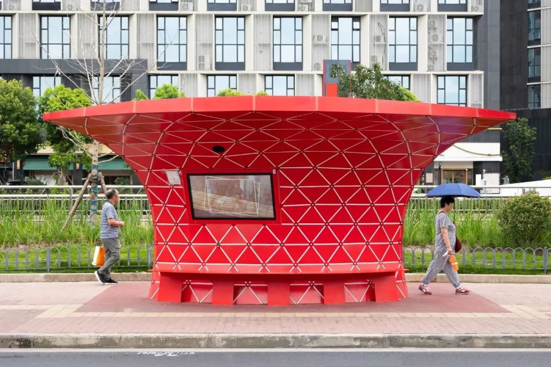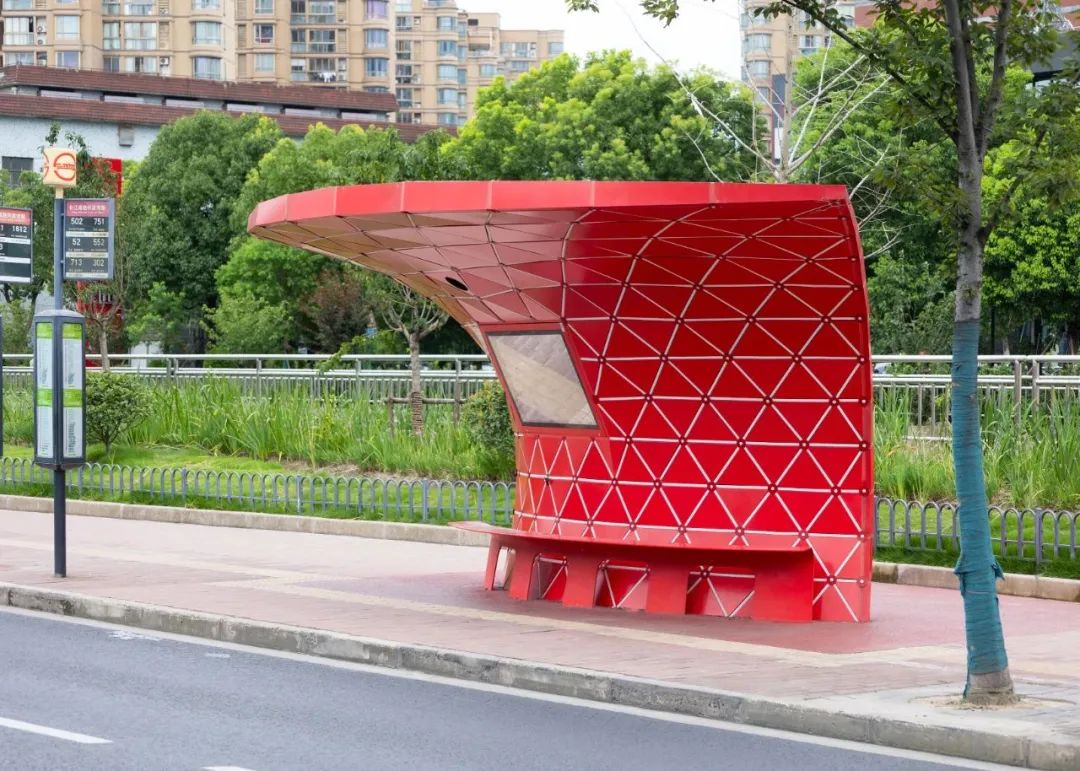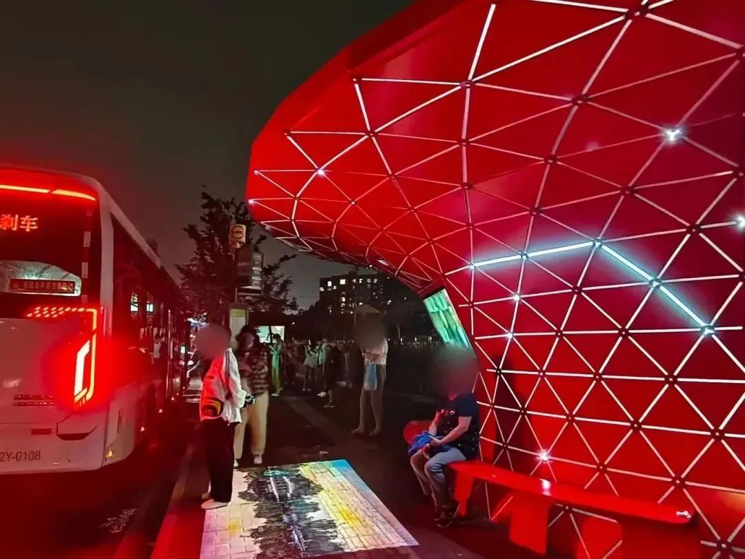长江南路何家湾路公交站是宝山区淞南市民交流的多个交汇站,靠近长江南路轨道交汇站和办公园区。公交车站的红色调格外醒目,采用了“星座主题” 造型可变 “光影交互”的设计理念,将年轻人喜爱的元素如星空、宇宙、星体等融入到造型中。