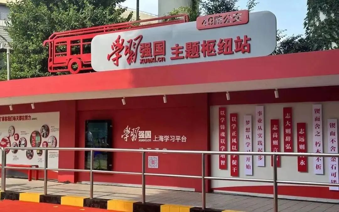 49路学习强国主题枢纽站作为上海第一个公交枢纽线下学习阵地,利用平台候车空间打造了一条全新的文化走廊,有机整合了景观、功能、文化等多重属性,使公交站不仅成为城市交通集中的地方,也成为学习理论的“加油站”。