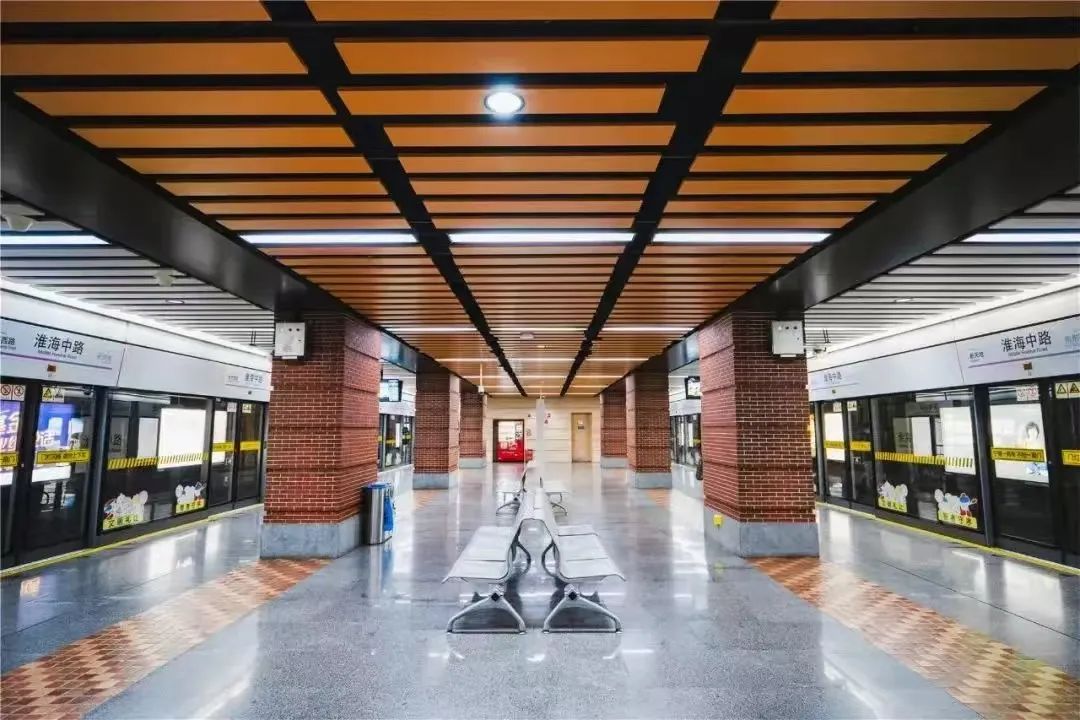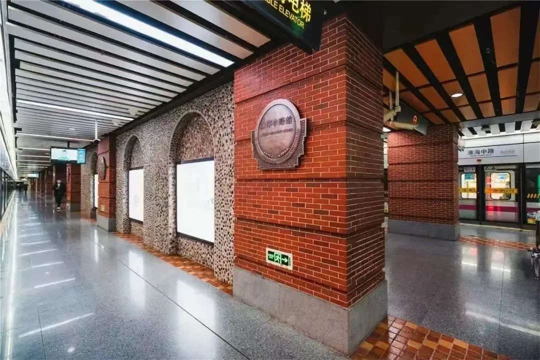 13号线淮海中路站用“复古风格”装饰。在平台上,柱子就像石库门的墙壁,深浅红色错落有致,四色仿古瓷砖铺在地上。