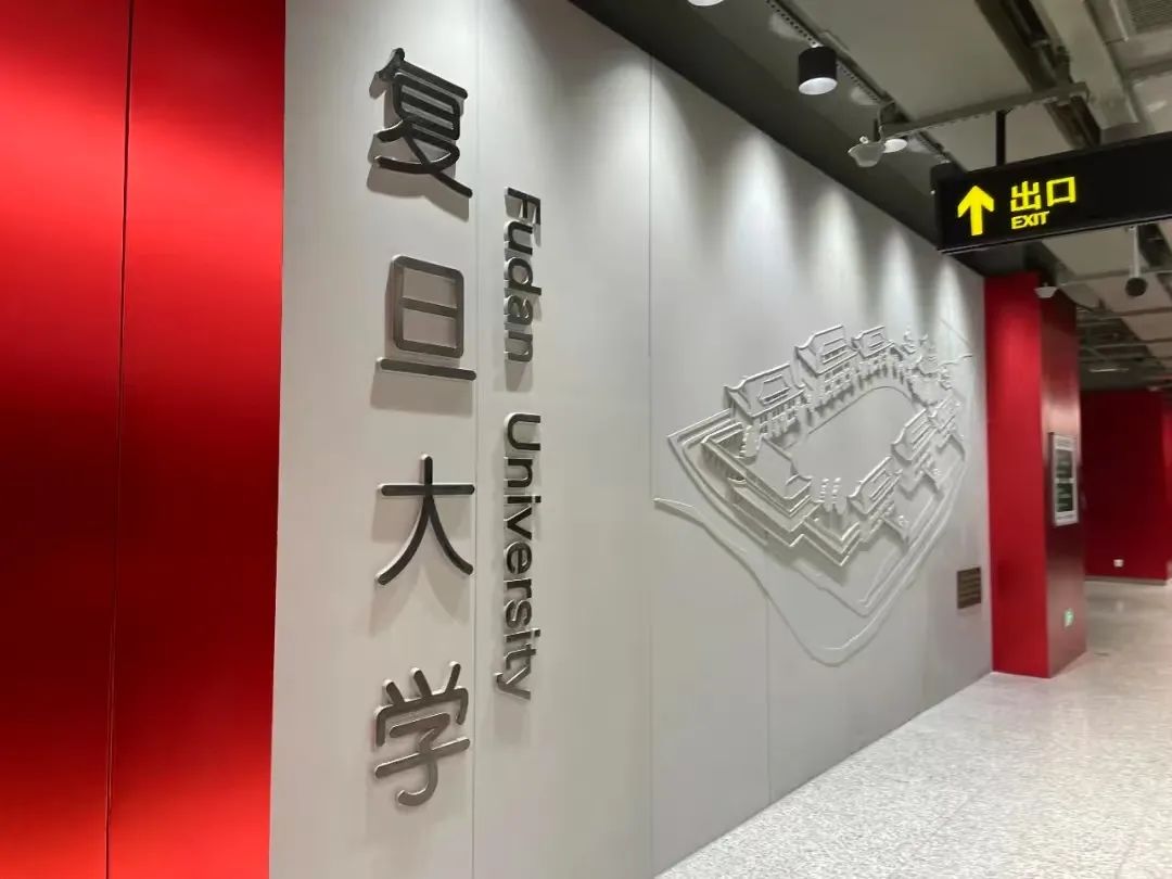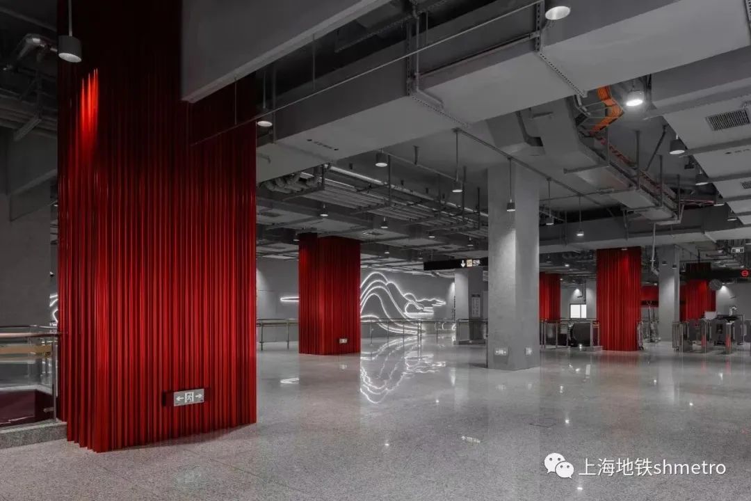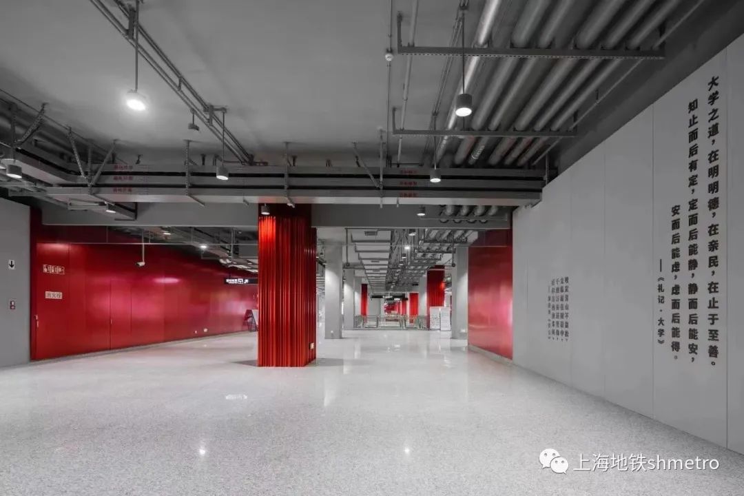 走进18号线复旦大学站,最直观的感受就是大比例的红色,明亮而深邃。水泥质地的灰色简单而低调。这种“红与灰”与复旦大学的相辉堂遥相呼应。