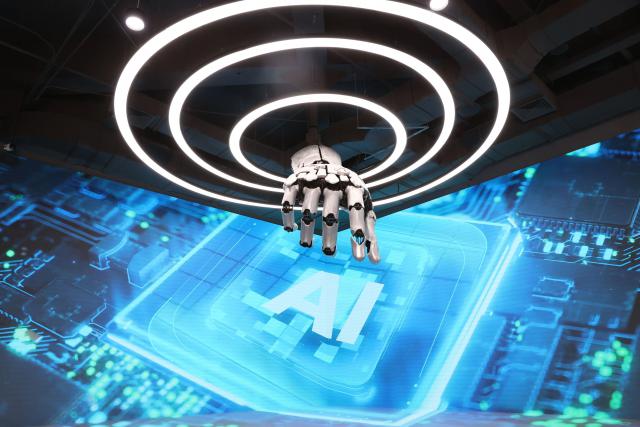 一只机械手从天而降,机器人大世界展厅。数据图