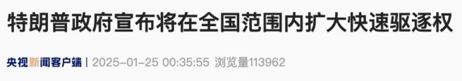 当地时间1月24日,美国特朗普政府宣布将在全国范围内扩大快速驱赶权,允许移民官员在未经法官审理的情况下驱赶移民。