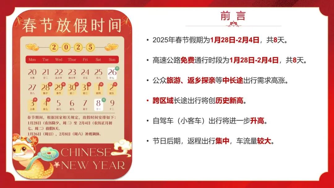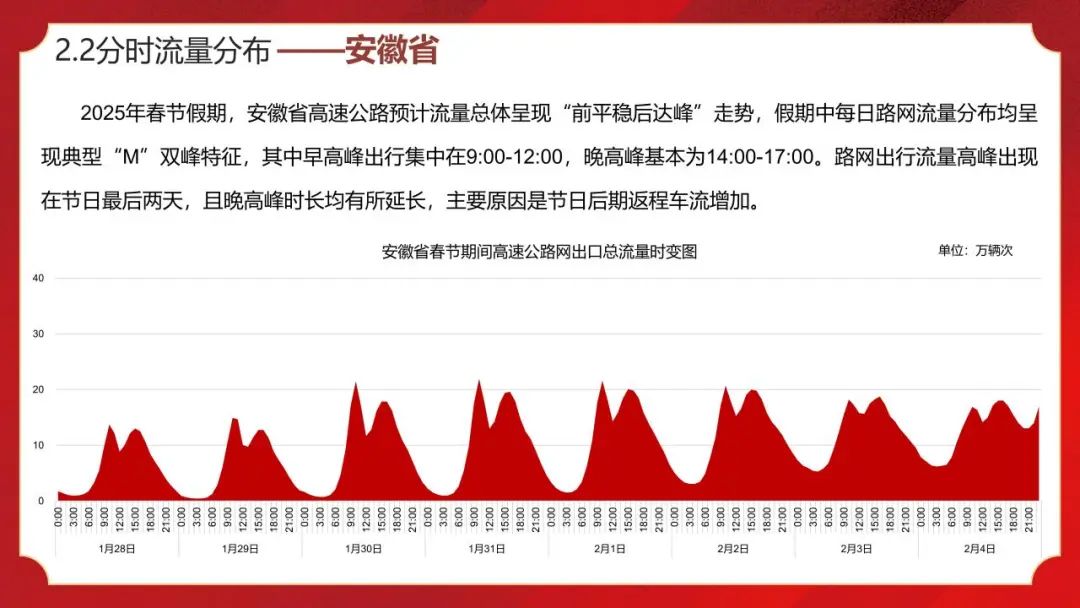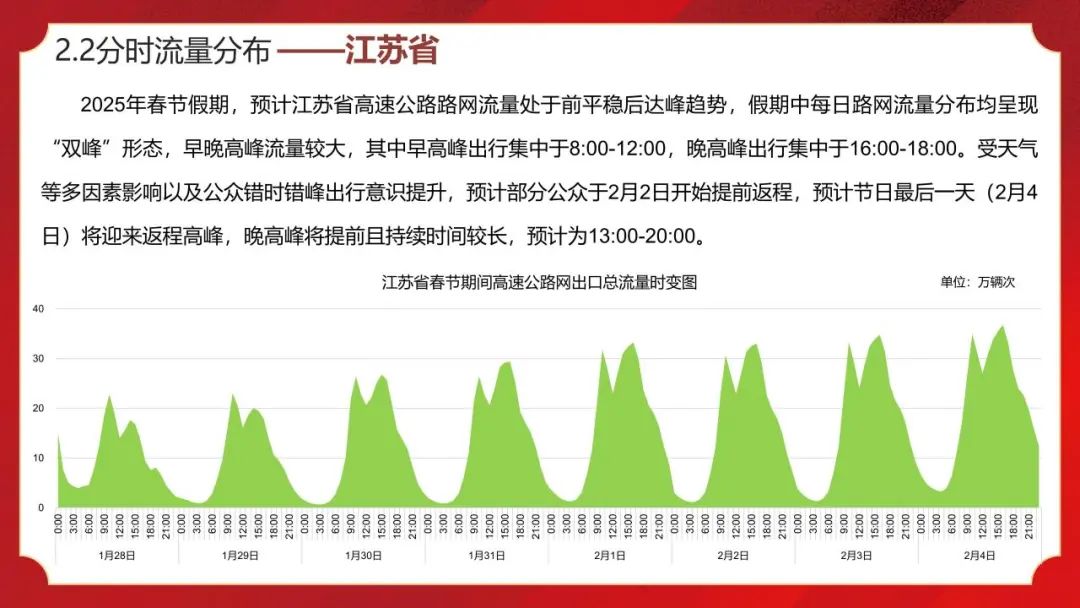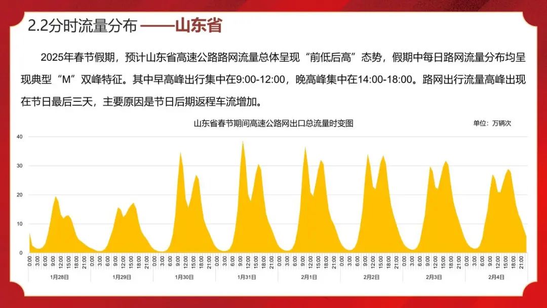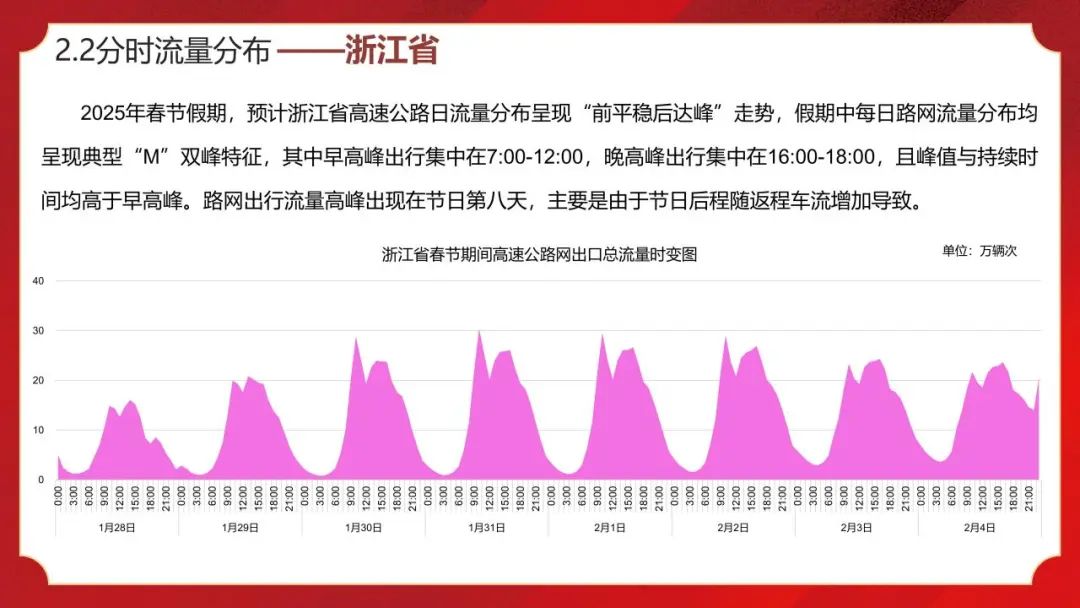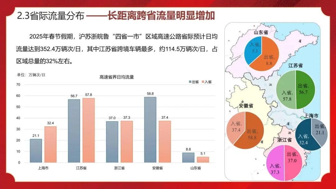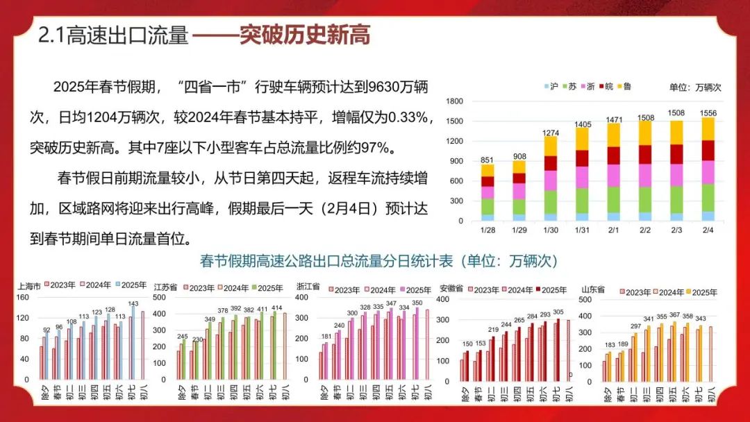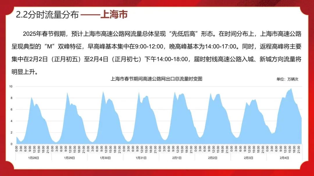 据市交通委指挥中心介绍,2025年春节假期,沪苏、浙江、皖鲁“四省一市”预计行驶车辆数量将达到9630万辆,平均每天1204万辆,与2024年春节基本持平。春节假期前期流量较小。从节日第四天开始,返程车流量不断增加,区域路网将迎来出行高峰。预计春节期间最后一天(2月4日)单日流量将达到首位。详情↓