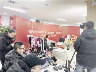 在创业对接活动区,创业孵化基地集中对接宣传服务,相关金融服务机构为有贷款需求的企业提供政策咨询和现场解疑。直播带岗区在室内现场搭建了直播矩阵进行直播带岗。主播在线发布就业机会和政策咨询,带领众多考生“云”参观会议。考生可以通过Tiktok平台的直播间在线提交简历。政府服务直播 媒体宣传方式,帮助农民工等重点群体高质量、充分就业。在劳务品牌展厅,“小站稻种植者”、“柳青年画家”、“七里海河蟹面制作者”、“骆驼屋烧鸡制作者”等。 8 天津特色劳务品牌家具在专区现场展示。非物质“盘扣”被嵌入相框中,犹如一幅画,蕴含着含蓄与优雅。一位前来找工作的女士说,她平时喜欢做手工,随着人们对中式服装的喜爱,盘扣手工技艺也一定会有就业空间。