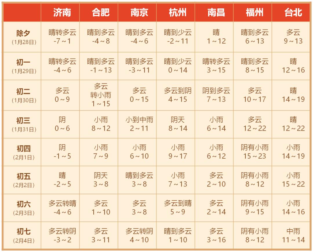 26-28日最低气温下降可达7~9℃,除夕夜和第一天(28-29日)的早晨,城市最低气温在零下1℃左右,有薄冰;郊区最低气温在零下3℃至零下5℃之间,有冷冻或严重冷冻。
