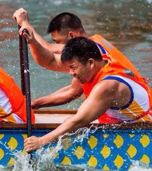 (3)划桨:“沉肘下肩,扭腰侧卧”,伸直手,上手微微弯曲,打开肩夹,将桨板向前插入水中,用力拉动,使桨和水形成反向力,促进龙舟前进。按照划桨的频率,在蹬船前用力蹬船,可以更好的承载水力,更有力的划船,让龙舟前进更快。