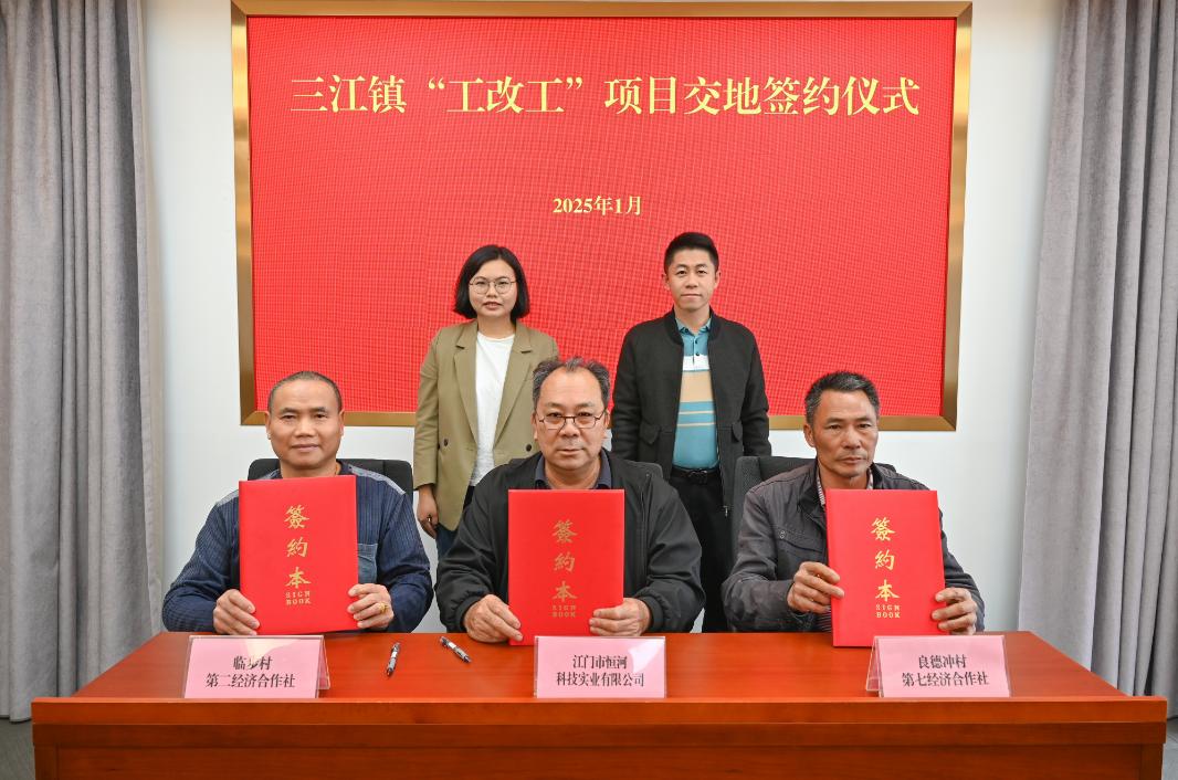 1月22日下午,三江镇举行“工业改造”项目土地签约仪式。江门恒河科技工业有限公司与三江镇良德冲村第七经济合作社、临步村第二经济合作社签订了《集体经营性建设用地使用权转让合同》。据悉,这是新会第一次“工业改造” 进入市场的项目。